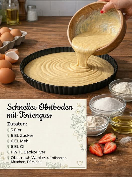 Für den Guss alle Zutaten zuerst mit 1 Ei stark schlagen, falls die Masse zu fest erscheint, ein weiteres Ei hinzu fügen.