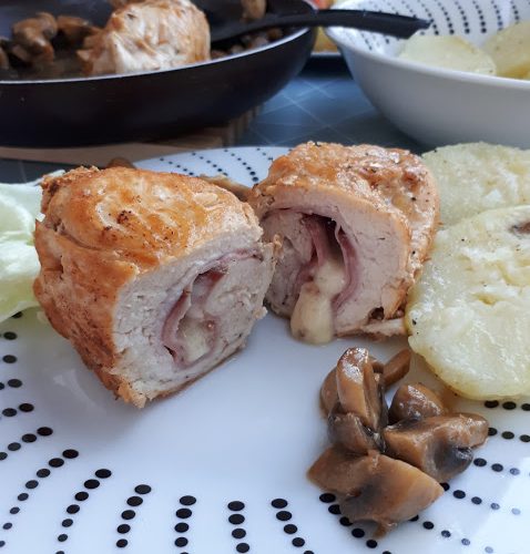 Place a slice of ham on the chicken fillet, a slice of cheese over it, fold into a steak and fasten with toothpicks.