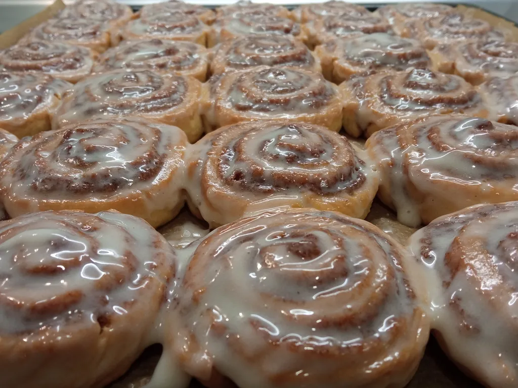 Preheat the oven to 180 degrees Celsius. Remove the plastic wrap and cloth and bake the cinnamon rolls for 20-25 minutes or until they are just lightly browned on the edges.