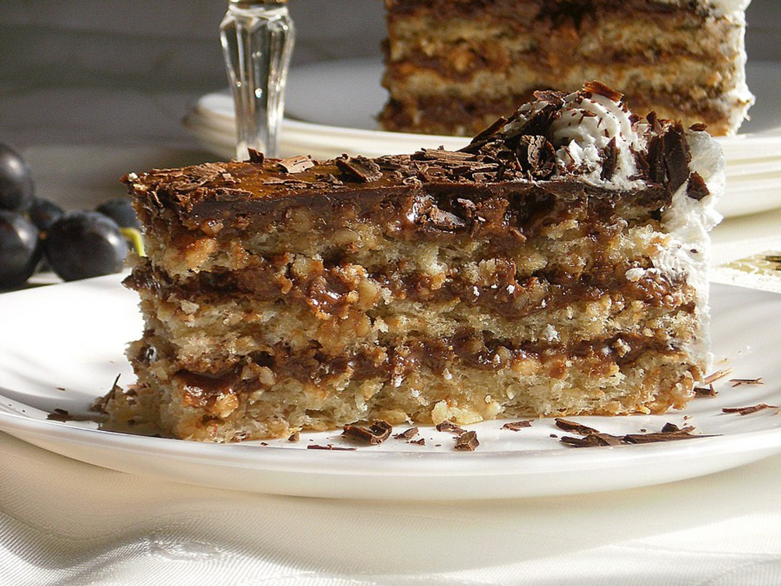 In the same way, coat the second crust with nutella, sprinkle with peanuts and a Snickers chocolate bar, and coat with chocolate cream. Spread the entire cake with whipped cream and decorate with peanuts, a Snickers chocolate bar and chocolate and caramel topping. If desired, decorate the sides of the cake with crushed biscuits and peanuts.
