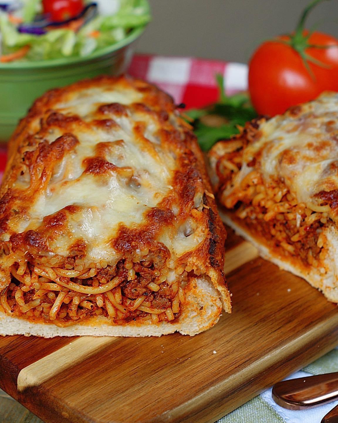 While meat sauce is simmering, cut the Italian bread loaf in half using a bread knife. Carve out the middle of each half of the loaf. Remove any remaining bread to create a large hollow in each half. Brush insides of the hollows and sides of the halves with butter. Sprinkle with garlic powder. Toast in oven.