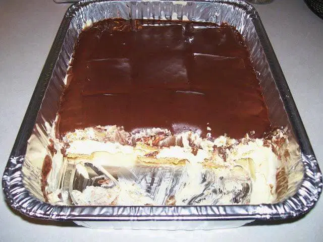 Put the final layer of graham crackers on top with bumpy side down. This will help the top look more smooth when you go to put the frosting on top. Once again, cut and shape crackers accordingly to avoid pits and cracks.