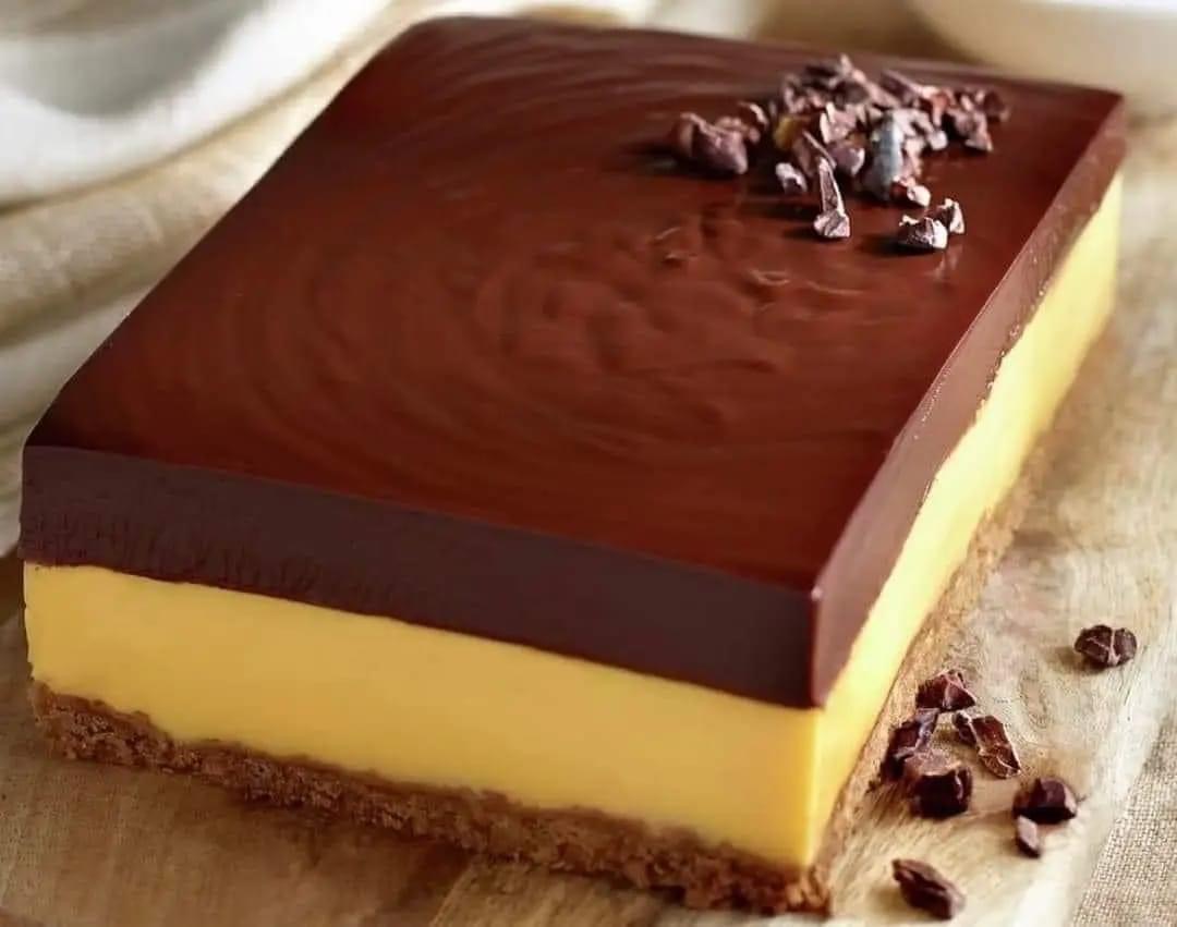 Break the chocolate into pieces and place it in a bowl. Heat the cream until it boils and pour it over the chocolate; let stand 1 minute and stir with a few rods until melted. Then, let it cool down and add it to the mold, on top of the cream layer.