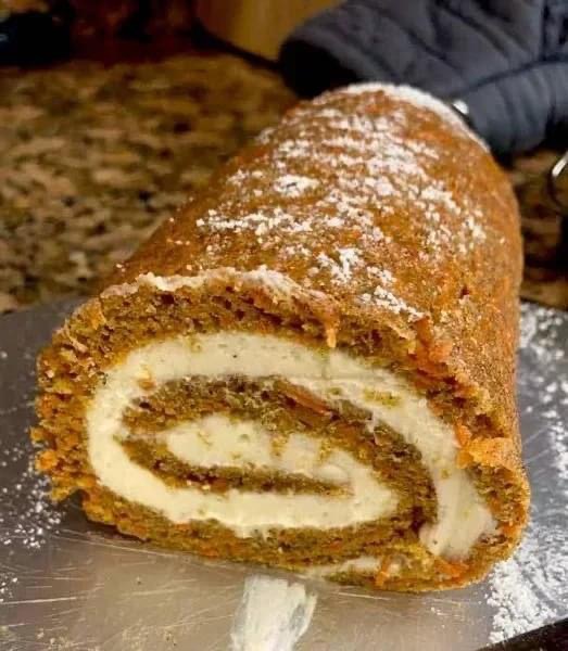 - Reserve about 1/2 cup of the frosting in a small bowl and set aside. Carefully unroll the cake. Using a small offset spatula, spread the remaining frosting evenly over the cake.ย Carefully re-roll the cake, using the parchment paper as a guide. Place the cake roll on a platter. Frost the sides and ends of the cake with the remaining frosting and press shredded coconut all over the surface.