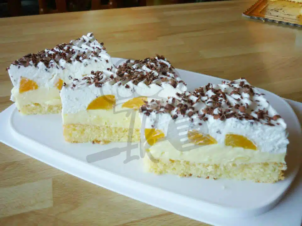 Die Creme auf den erkalteten Kuchenboden streichen und mit klein geschnittenen Pfirsichen belegen.