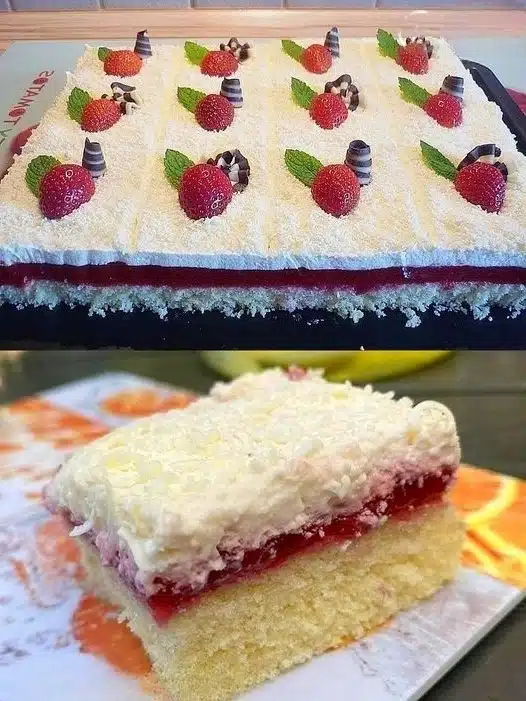 Den Tortenguss nach Packungsanweisung zubereiten und mit der Erdbeermasse verrรผhren. Diesen Erdbeerguss auf den abgekรผhlten Teig streichen. Abkรผhlen lassen.