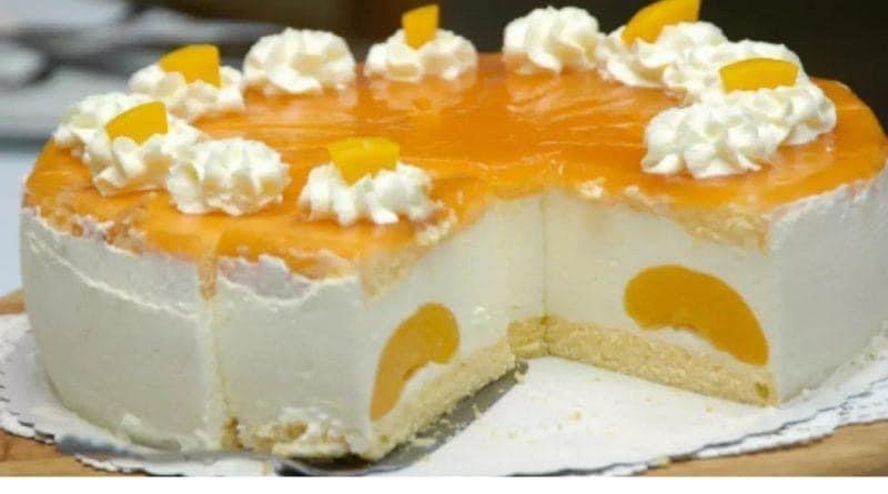 Fรผr die Verzierung Pfirsichhรคlfte in kleine Stรผcke schneiden. Sahne steif schlagen. Tortenrand damit bestreichen. Sahnetupfer auf die Torte spritzen. Mit Pfirsichstรผcken belegen.