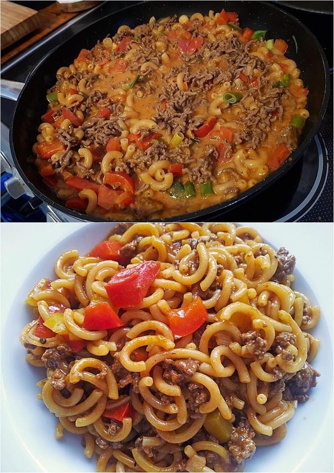 2. Zum Hack geben und kurz mit anbraten. Die Brรผhe angieรen und die Gabelspaghetti unterrรผhren.