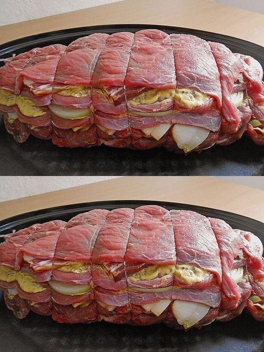 1. Als erstes eine Scheibe Rouladenfleisch hinlegen und gut mit Senf bestreichen, mitPfeffer und wรผrzen.