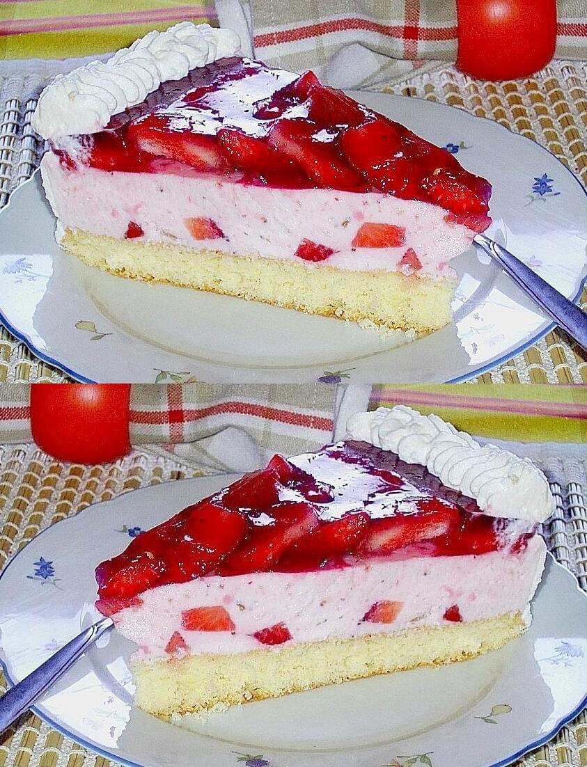 4. In den Quark rรผhren. Nun die Sahne steif schlagen und unterheben. Alles auf den ausgekรผhlten Biskuitboden streichen.