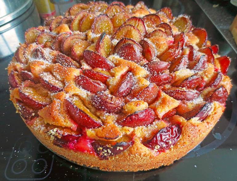 Pflaumenhälften mit der Spitze in den Teig stecken, dicht an dicht. Springform sicherheitshalber mit Alufolie von unten verpacken (ausgelaufene Fruchtsäfte sind das Übelste für den Ofen. Darauf achten, dass die nicht-reflektierende Seite der Folie nach außen zeigt).