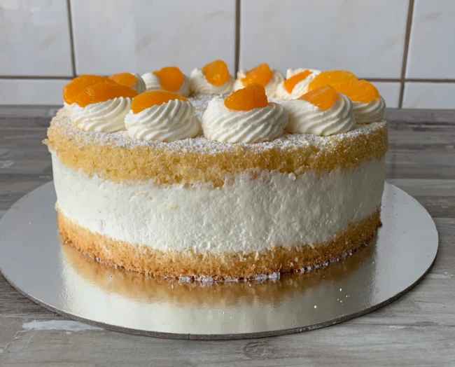 Den unteren Biskuitboden in einen Tortenring legen. Die Sahne-Quarkmasse daraufgeben. Dadrauf die 2. Hälfte des Bodens legen. Über Nacht in den Kühlschrank stellen, damit die Sahnemasse fest wird.