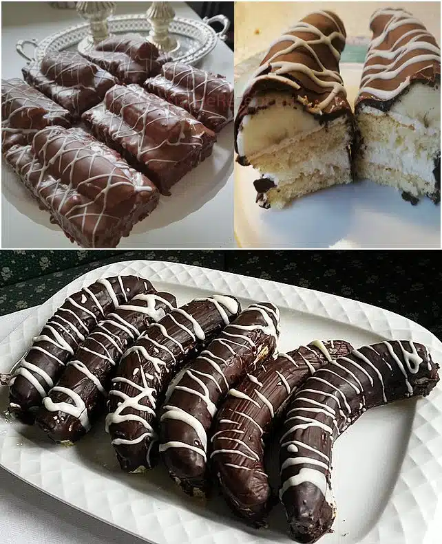 Immer 2 Streifen nehmen die erste mit Creme bestreichen… Die 2 drauflegen… Wieder Creme drauf streichen… Dann die halbierte Banane drauf legen und dann mit schoki übergießen.. Ich habe das mit ner sossen Kelle gemacht …Man braucht ne Menge mind. 3 Becher kakao glasur