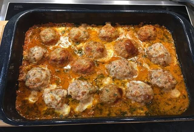 Das Hackfleisch mit Salz und Pfeffer würzen. Evtl. noch Kräuter wie Oregano, Thymian und/oder Basilikum und nach Geschmack Knoblauch dazugeben. 12 – 15 kleine Bällchen formen und in eine Auflaufform legen.