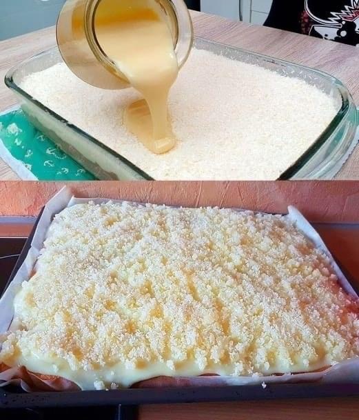 2. Nun den Teig auf ein mit Butter gefettetes Backblech oder Aufflauform mit hohem Rand geben und mit einer Kokos-Zucker-Mischung bestreuen.