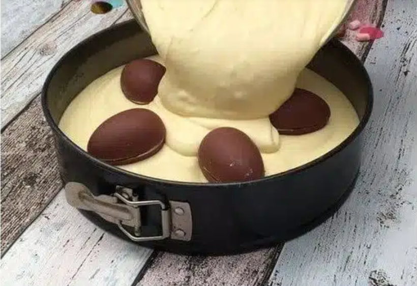 Nach ca. 20 Minuten die restlichen Schokoriegel auf dem Kuchen verteilen und weiter backen.