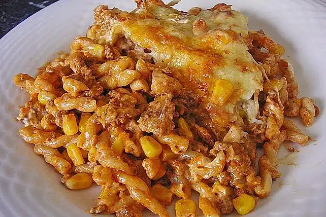 Die Nudeln in Salzwasser gar kochen und abtropfen lassen. Unter das Hackfleisch mischen und alles in eine Auflaufform füllen.