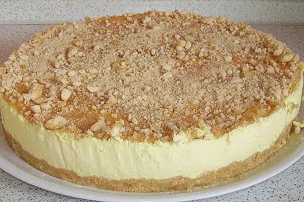 Zuerst Biskuit zerkleinern. 3/4 Tasse Brรถsel als Belag aufheben. Danach den Rest mit flรผssiger Butter verarbeiten und drรผcken Sie auf den Boden einer Springform.