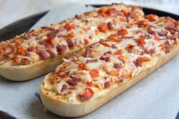 Das Pizzabaguette mit wenig Olivenรถl betrรคufeln, im heiรen Ofen etwa 10 Minuten lang รผberbacken und dann sofort servieren.