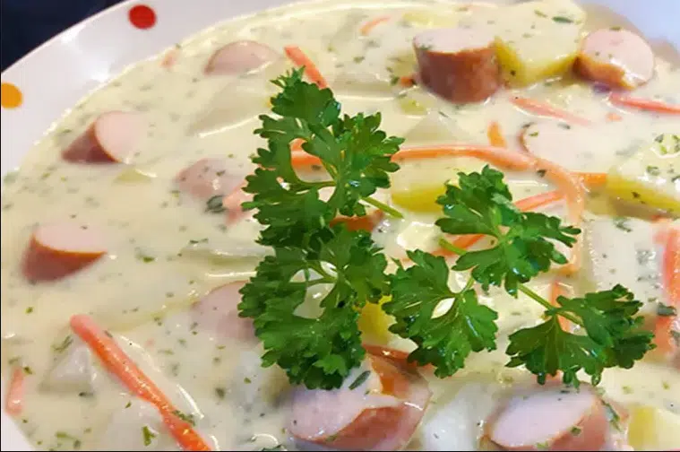 Kartoffel schälen und in 0,5cm große Würfel schneiden. Möhren schälen und in dünne Scheiben schneiden. Paprika in kleine Würfel schneiden. Zwiebel fein würfeln. Knoblauchzehen abziehen. Krakauer in Scheiben schneiden. Lauch der Länge nach halbieren, waschen und in dünne Scheiben schneiden. Bohnen abgießen.