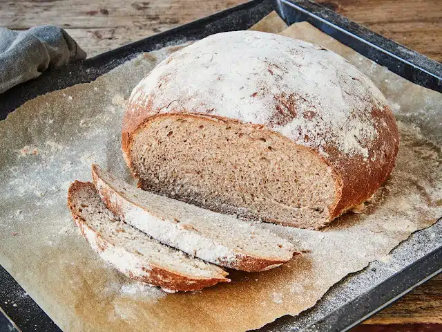 Teig auf einer leicht bemehlten Arbeitsflรคche durchkneten zu einem runden Laib formen. Auf ein mit Backpapier belegtes Blech setzen und zugedeckt ca. 60 Min. ruhen lassen.