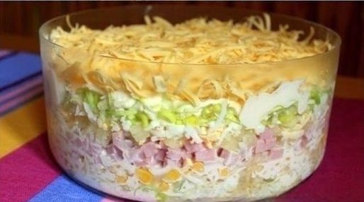 Abwechselnd Chinakohl, Zwiebeln und Fleischwurst Paprika sowie Erbsen und Mais in eine Salatschüssel schichten. Mayonnaise und Joghurt verrühren, mit Salz, Pfeffer sowie etwas Zucker abschmecken und über das geschichtete Gemüse geben. Salat abgedeckt über Nacht im Kühlschrank ziehen lassen.