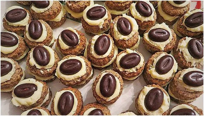 Nach dem Auskühlen die streichfeste Kuvertüre-Creme, bis auf 4 EL, auf die Hälfte der Kekse streichen und mit den restlichen Keksen belegen. Rest Creme in die Mitte der Kekse geben und mit Mokkabohnen belegen. Mit Kakao bestäuben..