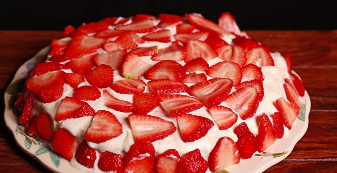 Eine Schüssel mit ca. 20 cm Durchmesser kalt ausspülen, bis zur Hälfte mit der Quarkmasse füllen, dann die Erdbeeren darauf geben und die restliche Quarkmasse darüber verteilen. Am besten über Nacht in den Kühlschrank stellen.