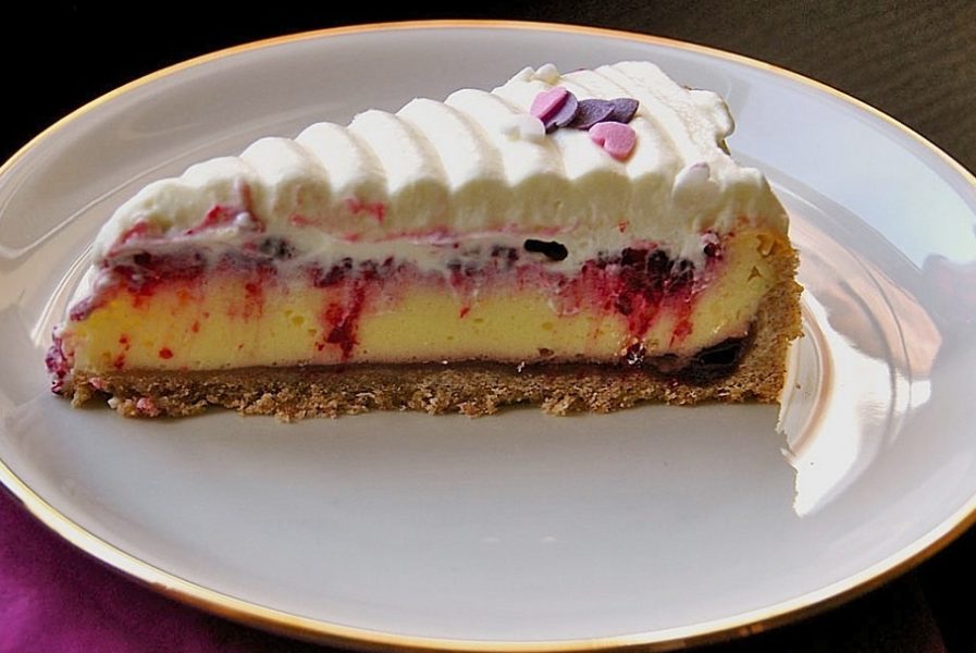 Den vorbereiteten Teig am Boden mit der Konfitรผre bestreichen, die Quarkmasse darauf geben, glatt streichen und die Himbeeren darauf verteilen.
