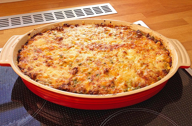 Die abgekรผhlten Kartoffeln in Scheiben schneiden. Mais und Champignons abtropfen lassen. Eine groรe Auflaufform immer abwechselnd mit einer Schicht Kartoffeln, Hackfleischmasse und Gemรผse fรผllen. Sahne und Crรจme fraรฎche mischen. Mit Salz, Pfeffer und Paprika gut wรผrzen.
