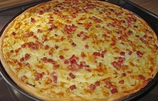Den Belag dann in die mit dem Teig ausgelegte Kuchenform geben und anschließend noch mit dem geräucherten Schinken und dem Kümmel bestreuen.