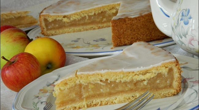 2. Jetzt die erste Hälfte vom Teig auf Backpapier ausrollen und dann in ein tiefes, rechteckiges Blech heben. Den Apfelmus mit Rosinen und Zimt vermischen und auf dem Teig verteilen. Die Teighälfte Nr. 2 ausrollen, auf dem Apfelmus verteilen und mit einer Gabel mehrmals einstechen.