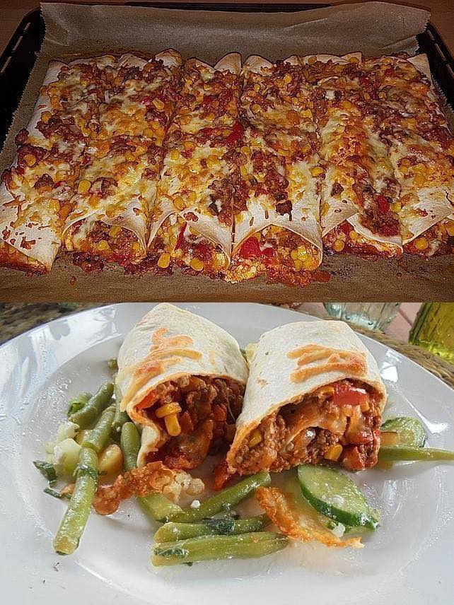 Mit den Gewรผrzen und etwas Zucker abschmecken. Die Tortillas mit der Crรจme fraรฎche bestreichen und die Hackfleischmasse gleichmรครŸig darauf verteilen. Mit etwas geriebenem Kรคse bestreuen. Die Tortillas zu Burritos aufrollen und in eine Auflaufform legen.