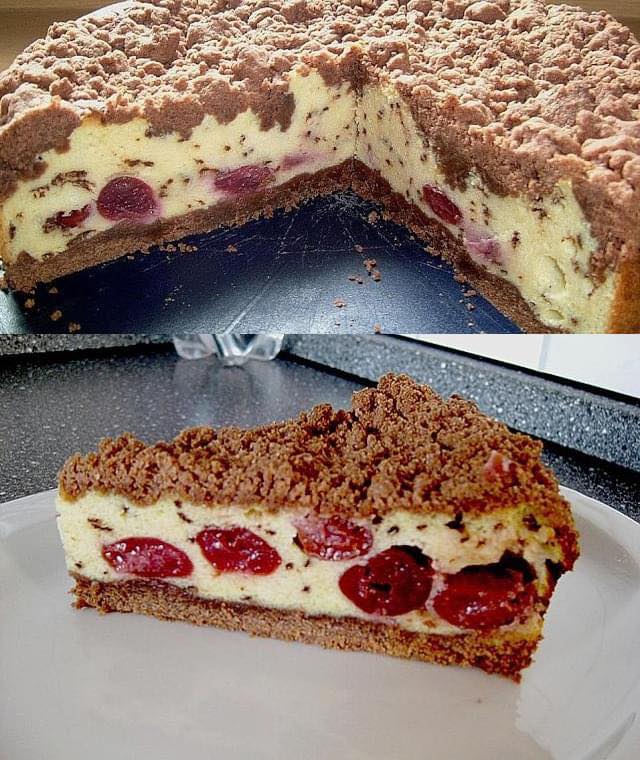Eiweiß steif schlagen. Eischnee, Kirschen und Hälfte der Schokostreusel unter die Quarkmasse heben. Auf dem Streuselboden verteilen. Restliche Schokostreusel darauf verteilen.