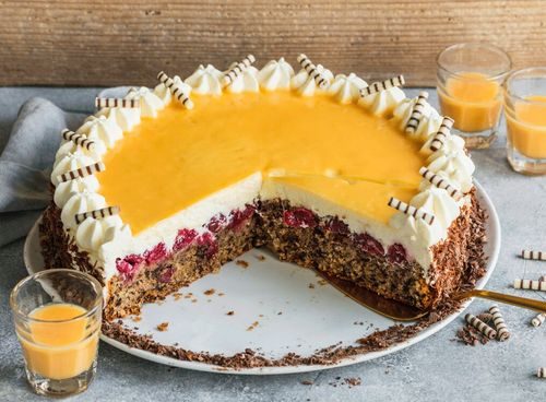 Für die Füllung Gelatine einweichen. Eierlikör oder Baileys, Frischkäse und Zucker verrühren. Gelatine ausdrücken, auflösen und mit 4 Esslöffeln der Creme verrühren. Die Mischung unter die Frischkäsemasse ziehen. Sahne steif schlagen und unterheben. Die Hälfte der Likörcreme auf den Boden geben. Den zweiten Boden darauf legen. Restliche Creme darauf streichen und die Torte mindestens 2 Stunden kalt stellen.