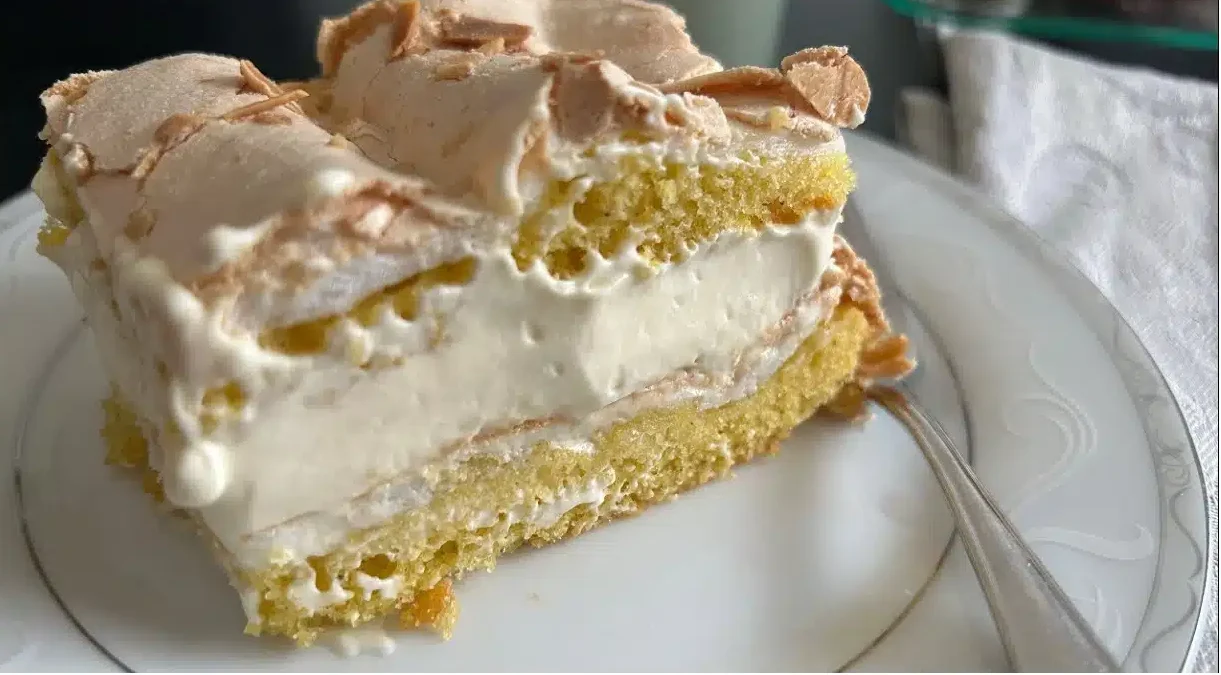 Die Backform mit Backpapier auslegen und den Kuchenteig mit der Soße bestreichen. Beiseite stellen, während das Baiser zubereitet wird.