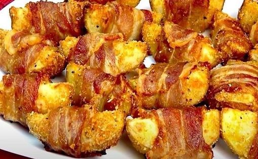 4. Die Speckscheiben um die Kartoffeln wickeln.