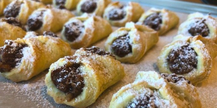 3. Jetzt den Teig relativ dick ausrollen und Kreise ausschneiden. Die Fรผllung jeweils mittig platzieren und den Teig in der Mitte mit den Fingern zusammendrรผcken.