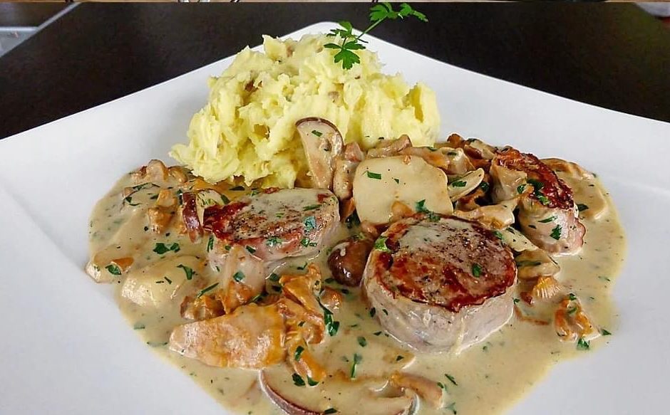 Medaillons darauf verteilen, die Pilzsoแบe darรผbergeben und mit der Petersilie bestreuen. Alles sofort heiร servieren. Fertig!
