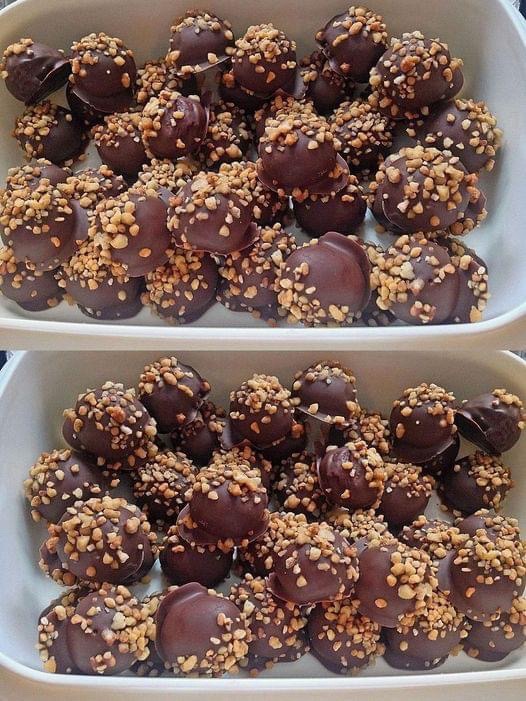 Die Kugeln nacheinander, am besten mithilfe einer Pralinengabel, mit Schokolade รผberziehen.