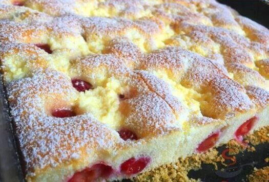 - Den Teig auf ein mit Backpapier ausgelegtes Backblech geben und mit entsteinten Kirschen belegen.