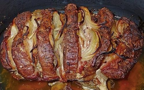 Den Schweinenacken in Scheiben anschneiden (dabei nicht ganz durchschneiden), so dass Taschen zum Füllen entstehen. Den Braten salzen und mit Pfeffer würzen. Anschließend in der ersten Tasche etwas dünn geschnittenen Bauchspeck einfüllen. In die nächste Tasche reichlich Zwiebelringe füllen. Die Taschen immer in Wechsel weiter füllen. Den gefüllten Braten in einem Bräter mit Deckel geben und zudecken. Erst einmal im Kühlschrank ca. 12-24 Std. ziehen lassen.