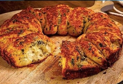 Springform fetten und mit Backpapier auslegen. Teig durchkneten, zu einer Rolle formen, in 4-5 cm breite Scheiben schneiden. Scheiben mit Kรคsemischung mischen, gefรคchert zu einem Ring in die Form legen. Im Backofen ca. 40 Minuten backen, bis es goldbraun ist.