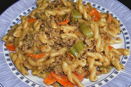 Mischen: Nudeln und Hackfleisch untermischen, abschmecken. Petersilie fein schneiden, vor dem Servieren darรผberstreuen.