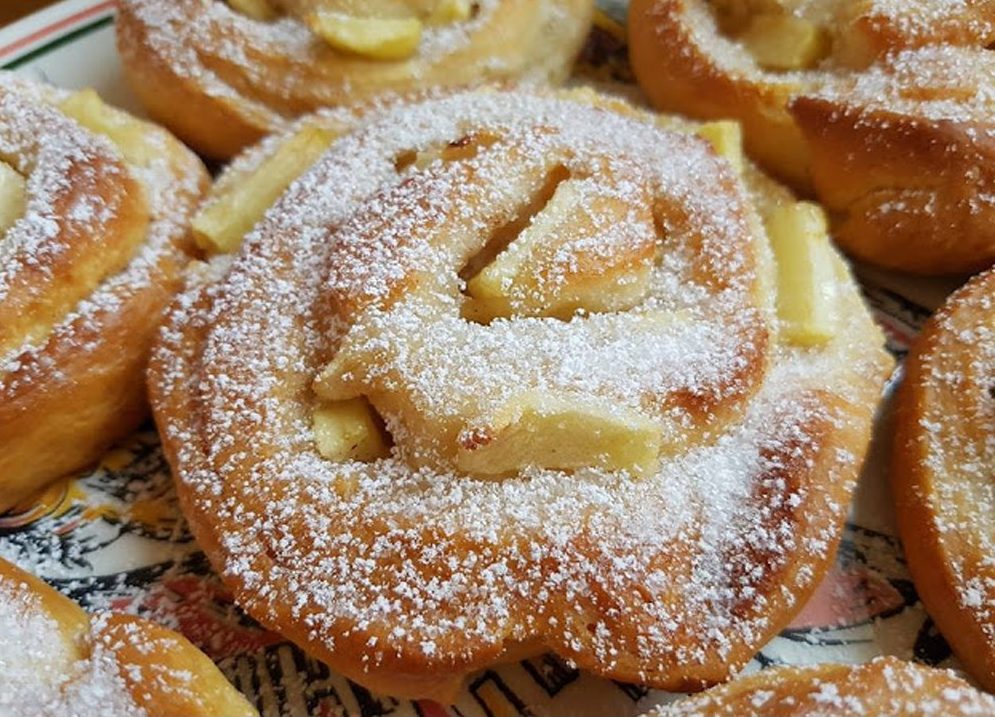5. Zuletzt die Scheiben mit etwas Abstand, auf ein mit Backpapier ausgelegtes Backblech legen und ca. 15 bis 20 Minuten backen. Die Apfelschnecken sollten hinterher ganz auskühlen.