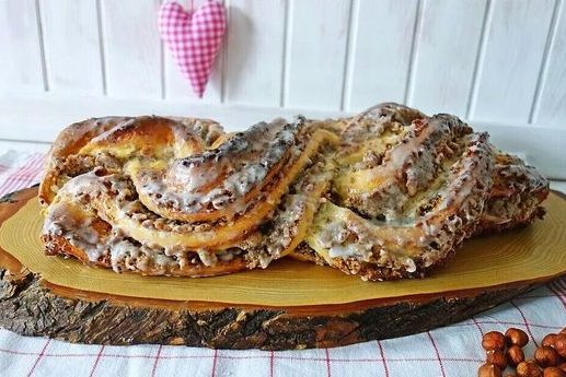 Danach Teig zu einem Rechteck (ca. 30×20 cm) ausrollen. Die Nussfüllung darauf verstreichen und den Teig aufrollen.