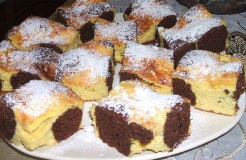 Jetzt 2/3 vom Teig auf ein gut gefettetes Backblech streichen. 1/3 Teig mit 3 – 4 EL Kakaopulver verrühren und mit einem Löffel kleine Häufchen auf den bereits verstrichenen Teig setzen.