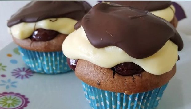 Wenn die Muffins fertig sind kleine Mulden in den Teig drรผcken und den Vanillepudding hinein geben.