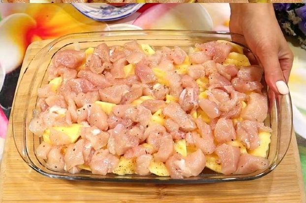 1. Zuerst die Kartoffeln waschen und in Wasser ca. 20 Min. kochen. Danach die Kartoffeln abschrecken, schälen und abkühlen lassen. Das Fleisch waschen, trocken tupfen und würfeln.Nun im heißen Öl rundherum ca. 5 Min. anbraten, mit Salz und Pfeffer würzen.