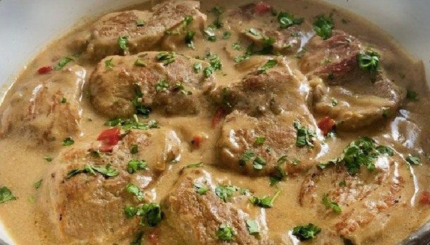 3. Als letztes die Soße mit Muskat,Salz und Pfeffer abschmecken. Den Fleisch zugeben und nochmals in der Soße erwärmen und Schnitzelstreifen anrichten. Nun den Reis dazu reichen. Geht super schnell und schmeckt einfach Schmakofatz!